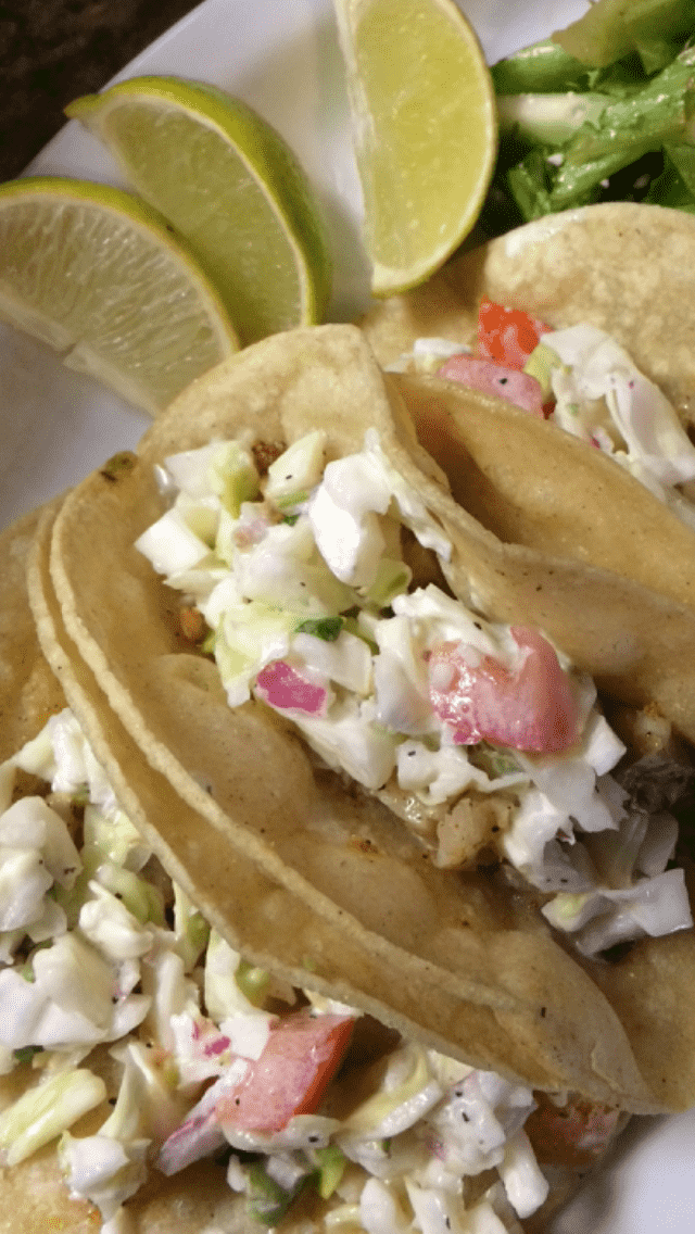 Fish Tacos....Cod, Shrimp, Mahi, Ahi or Salmon topped with our house cabbage salsa